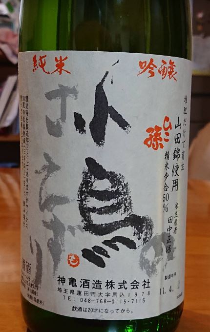 神亀酒造は江戸時代末期の嘉永元年(1848年)創業です。1987年には、仕込む酒のすべてを純米酒に転換し、戦後初の全量純米蔵として有名です。神亀酒造といえば「ひこ孫」が有名ですが、「ひこ孫」とは曽孫の意、三年以上の熟成を経た酒に冠らせる銘柄です。