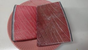三重県尾鷹市からふるさと納税の返礼品として「天然本マグロ中トロ」がブロックで届いていました。少し前に刺身で頂きました。とても美味しかったのですが、トロ身はスジが多めで量が多いと刺身でも途中から食べるのがきつくなります。「訳あり」だったからかもしれませんが。そこで古代からの知恵「火」を導入します。