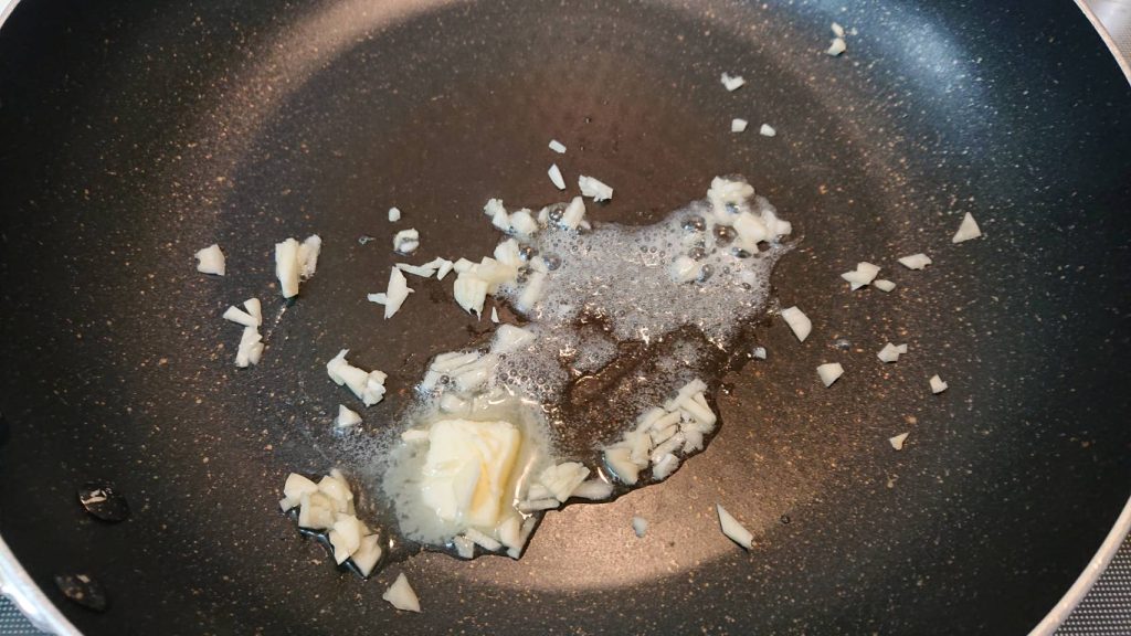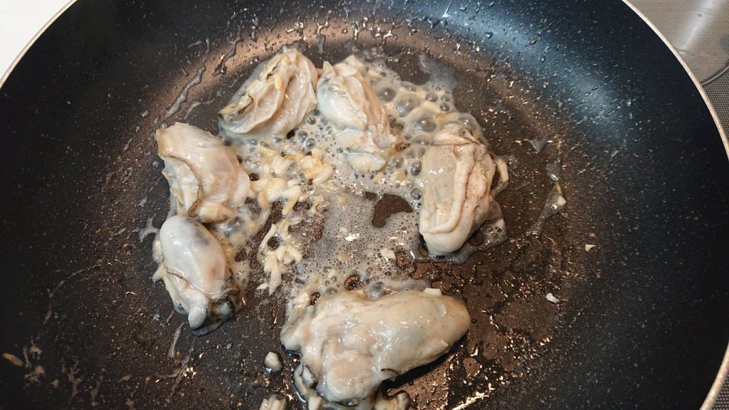 ② 刻んだニンニクとバター10gをフライパンで炒め、牡蠣を投入。