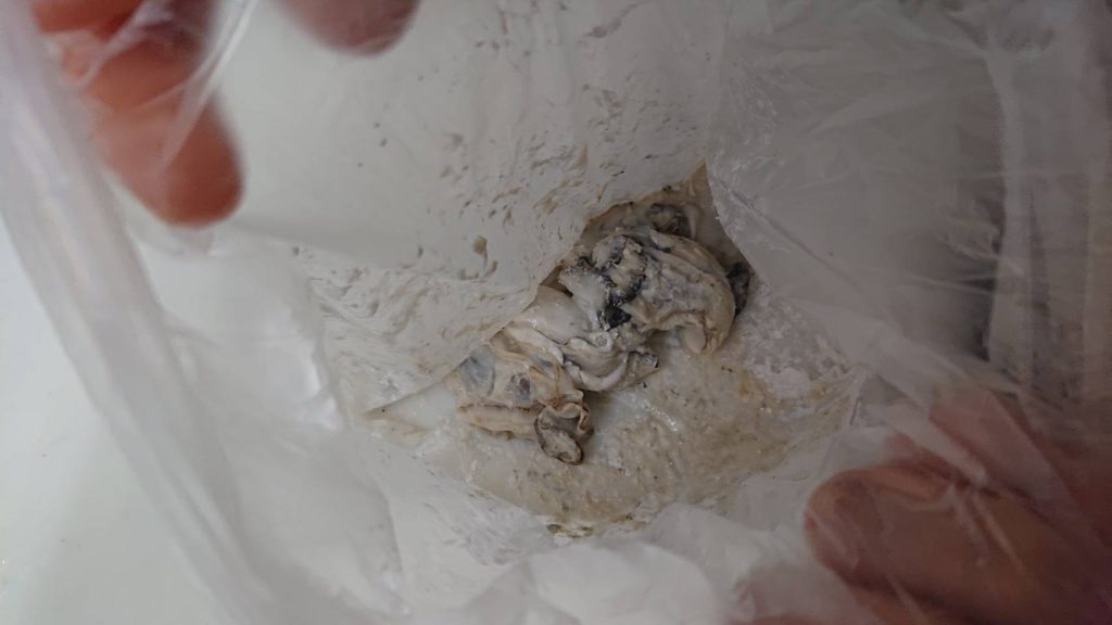 ① 牡蠣は塩を軽く塩をふり、水で洗います。水をキッチンペーパーでふき取り、ビニール袋に入れて小麦粉を少々まぶします。ビニール袋を使うと洗う皿の数が減ります!