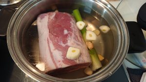 ① 巨大なお肉が入る大きめの鍋にお肉を入れて、お酒 100mL、長ネギ、ショウガ(皮付きを厚くスライス)、ニンニクを入れます。お肉全体が浸かるように水を入れて、強火で煮込みます。約30分。