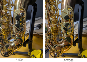 ネックを含めた全体の重さはA-500が2.45kg、A-WO20が2.65kgです(0.05kg単位、マウスピースは含まず)。通常の体重計で自分の体重を差し引く形で測定したので、若干の誤差があるかもしれません。A-WO20の方がやや重めなのは実感として間違いありません。